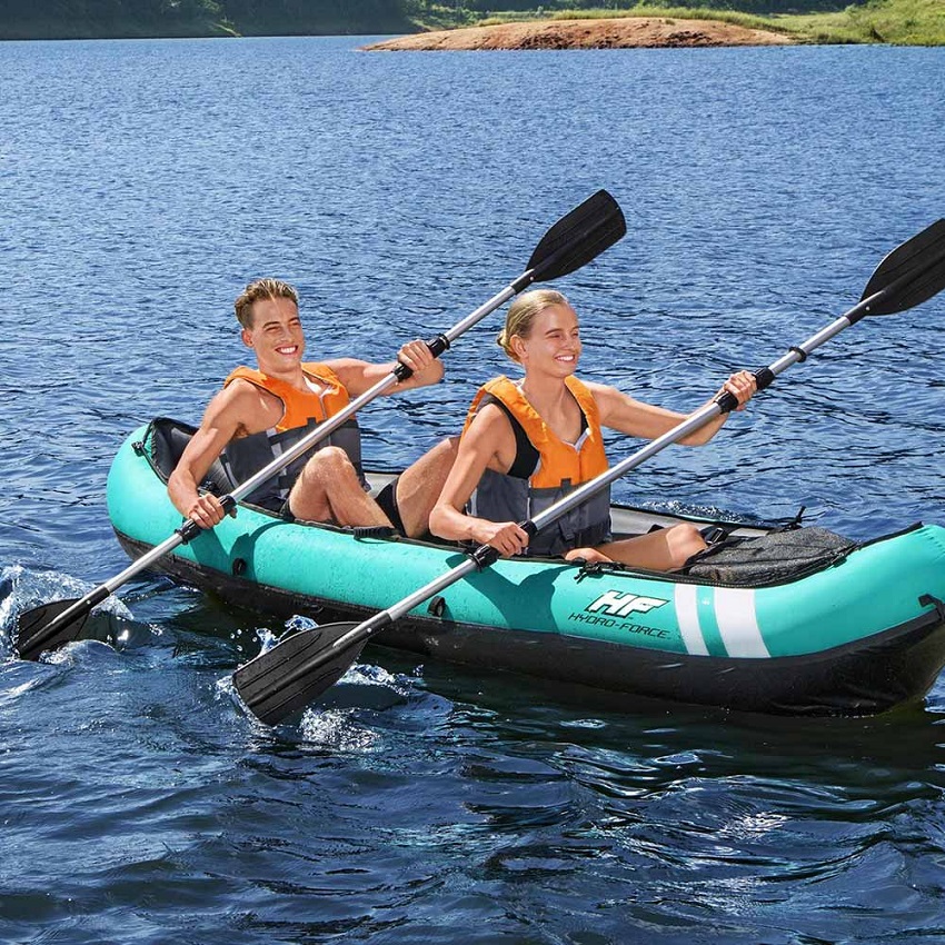 Contenuto della confezione: un kayak, una coppia di pagaie, una pompa manuale.