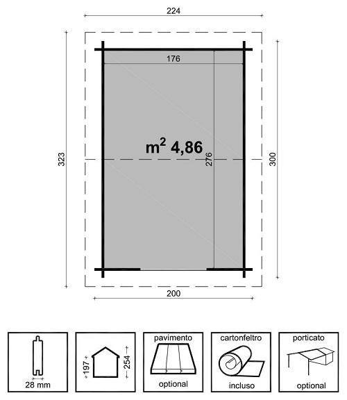 Casetta di legno in Abete impregnato in autoclave color marrone e essiccato Superficie Pavimento interna: mq 4,86 Altezza Massima: 254 cm