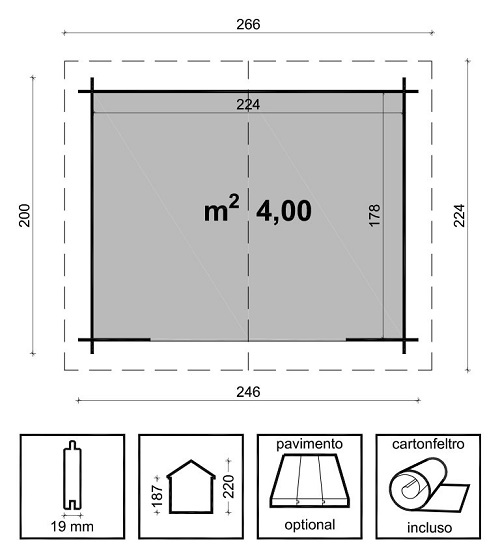Casetta di legno in Abete grezzo non trattato Superficie Pavimento interna: mq 3,98 Altezza Massima: 220 cm