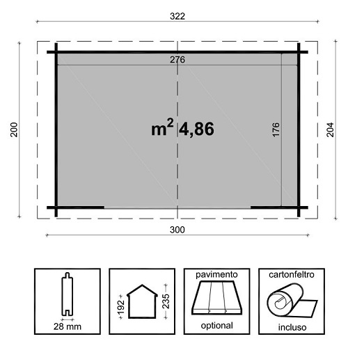Casetta di legno in Abete grezzo non trattato Superficie Pavimento interna: mq 4,86 Altezza Massima: 235 cm