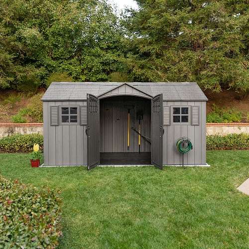 Casetta in polietilene alta densità a doppia parete (HDPE). Colore grigio con venature effetto legno, finitura spazzolata ruvida. Tetto realizzato con capriate in acciaio e dotato di lucernario a tutta lunghezza. Porta rinforzata con componenti in acciaio; chiusura con chiavistello.