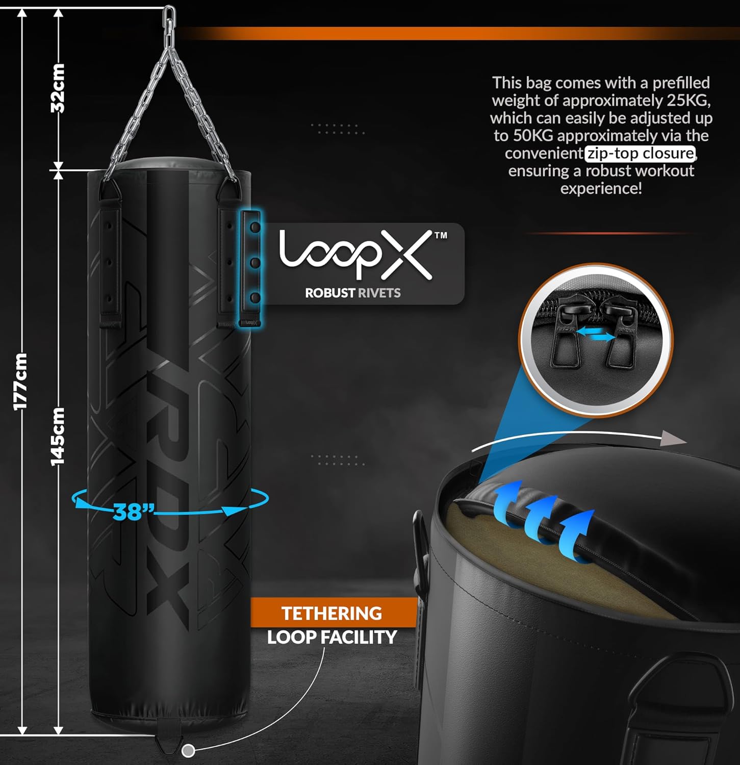 Provate un cambiamento di paradigma nel vostro allenamento con il nostro sacco, dotato dell'innovativa tecnologia quadrupla LoopX. Questa caratteristica impareggiabile integra rivetti di qualità superiore, anelli a D che garantiscono una straordinaria durata, una facile manovrabilità e un fissaggio stabile della catena in acciaio di alto calibro inclusa, creando un compagno di allenamento stabile e incrollabile che resiste ai colpi più potenti.