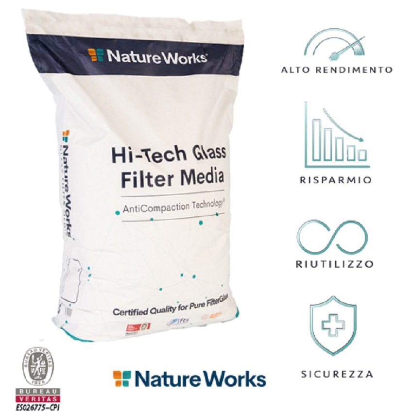 NATURE WORKS è realizzato con Vetro Attivo Vergine riciclato di elevata purezza, con un livello di qualità certificato da Bureau Veritas di almeno il 99,999%. È adatto a tutti i tipi di filtri a sabbia, sia per le piscine private, che per quelle comunali o pubbliche.